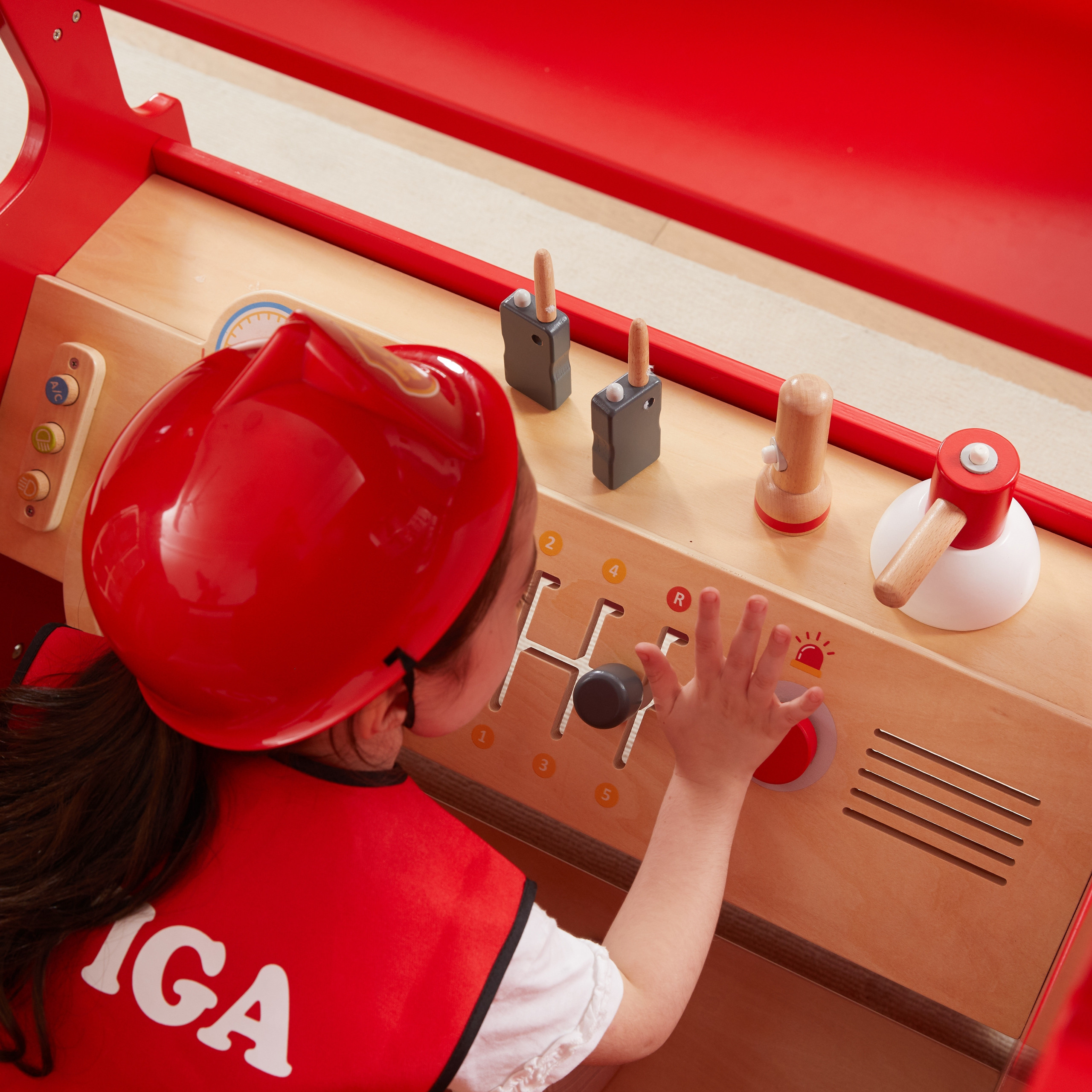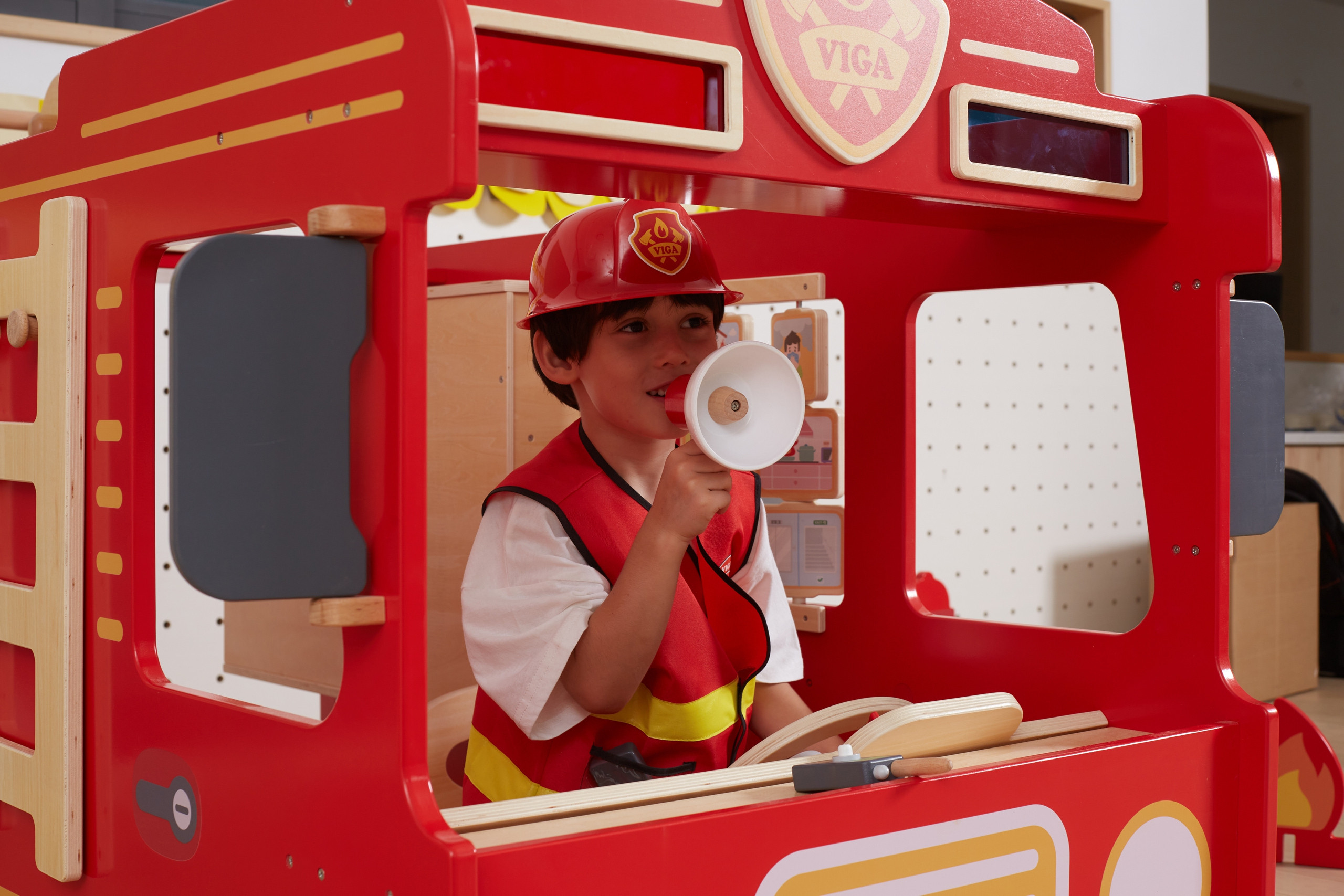 - Setet inkluderar en stor träbrandbil, pedagogiska element, en bräda med labyrint, två brandmansutrustningar (västar och hjälmar), två walkie-talkies, en ficklampa och en megafoon.
